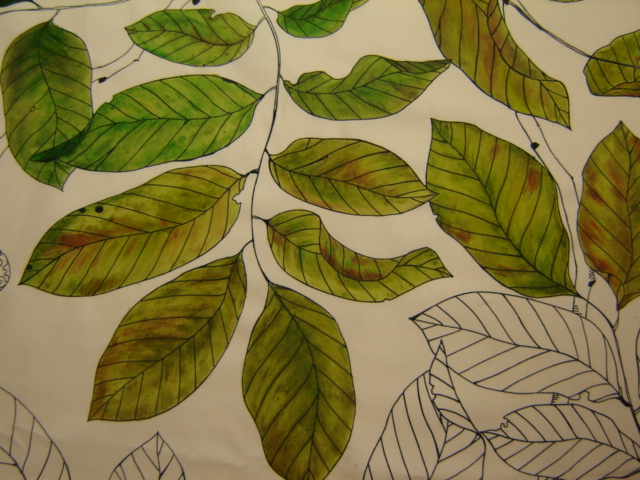 Well, I make samples for the next show. Vera bought some fabrics by Ikea and we are painting them. The leaves above are my job. And I’m also busy with the samples for the demo’s.